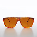 This awesome flat top sunglass features a gold striped accent brow line and amber blue blocking lens. Plastic frame with metal hinges and wire core temples.