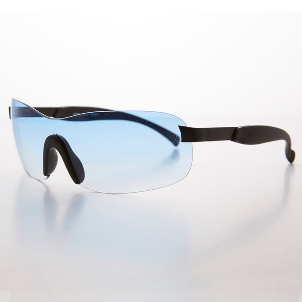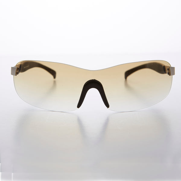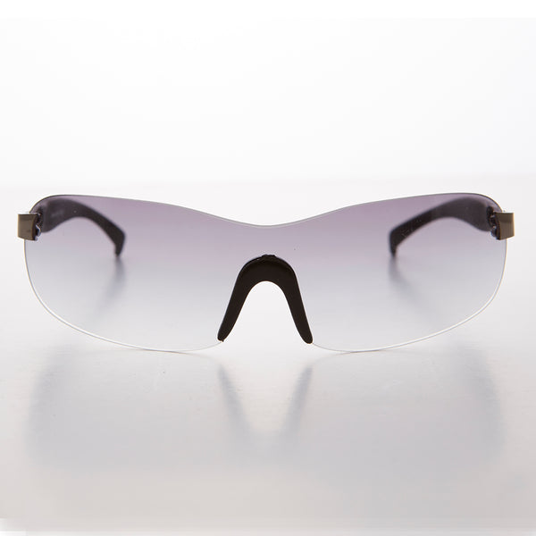 This Y2k shield sunglass features a rimless mono lens with comfortable rubber nose pieces for added secure fit. Lightweight and comfortable, great for everyday wear and light sports.