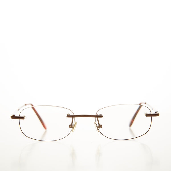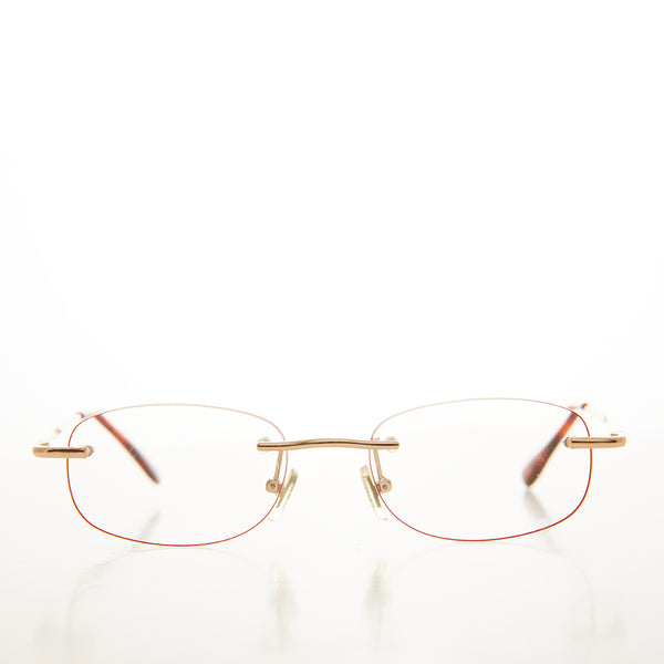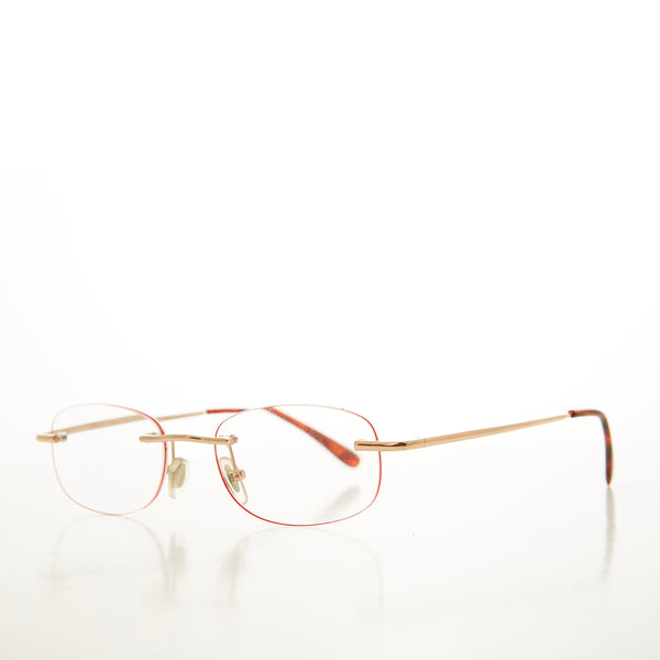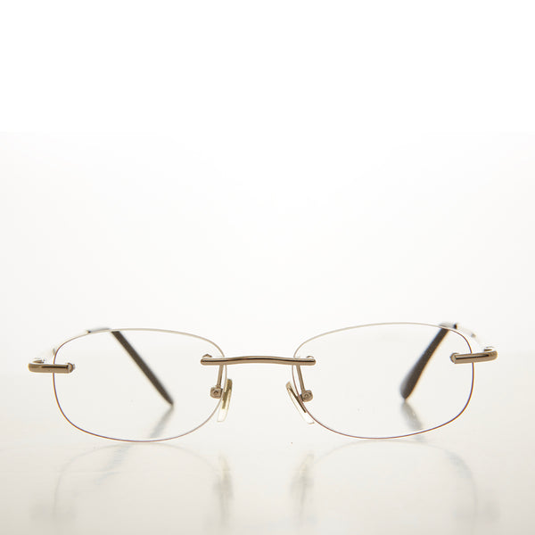 This classic reading glass features a rectangular oval rimless lens with comfort spring temples. New old stock. Never worn. Great condition.
