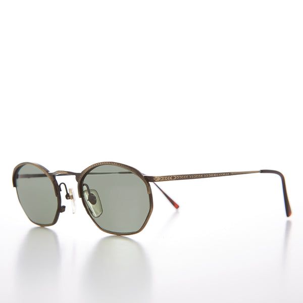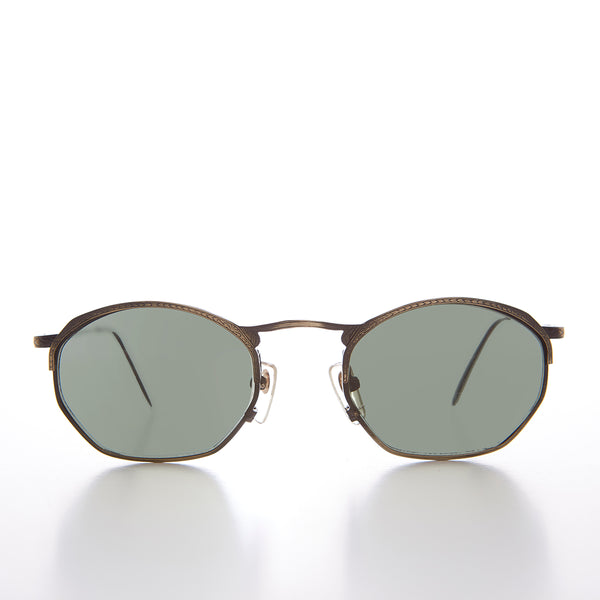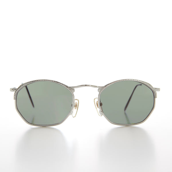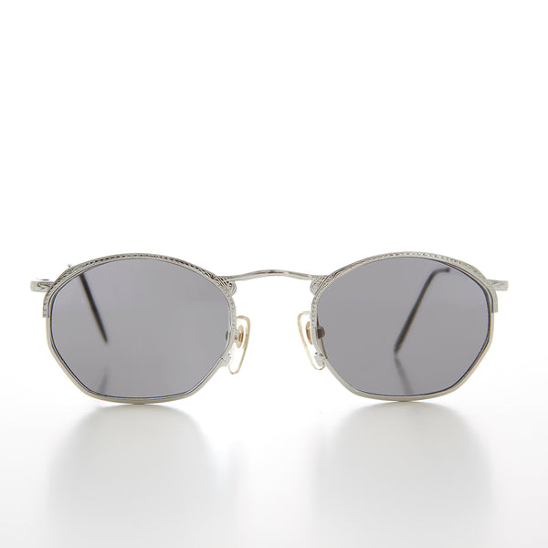 This unique 90s octagon sunglass features a notable embossed brow line and temples. Simple and elegant to dress up any wardrobe. Optical quality prescription friendly frame. New old stock. Never worn. great Condition. UV Protection.
