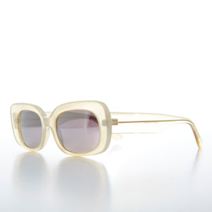 Super cute, 90s deadstock sunglass that features a bold pastel rectangular frame with light silver mirror lenses. This 60s style mod sunglass is essential to have in your sunglass collection. New old stock. Never worn. Great condition. UV Protection.