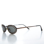 This stand out 90s sunglass features a cut out oval rim with with antiqued finished metal frame. New old stock. Never worn. Great condition. UV protection.